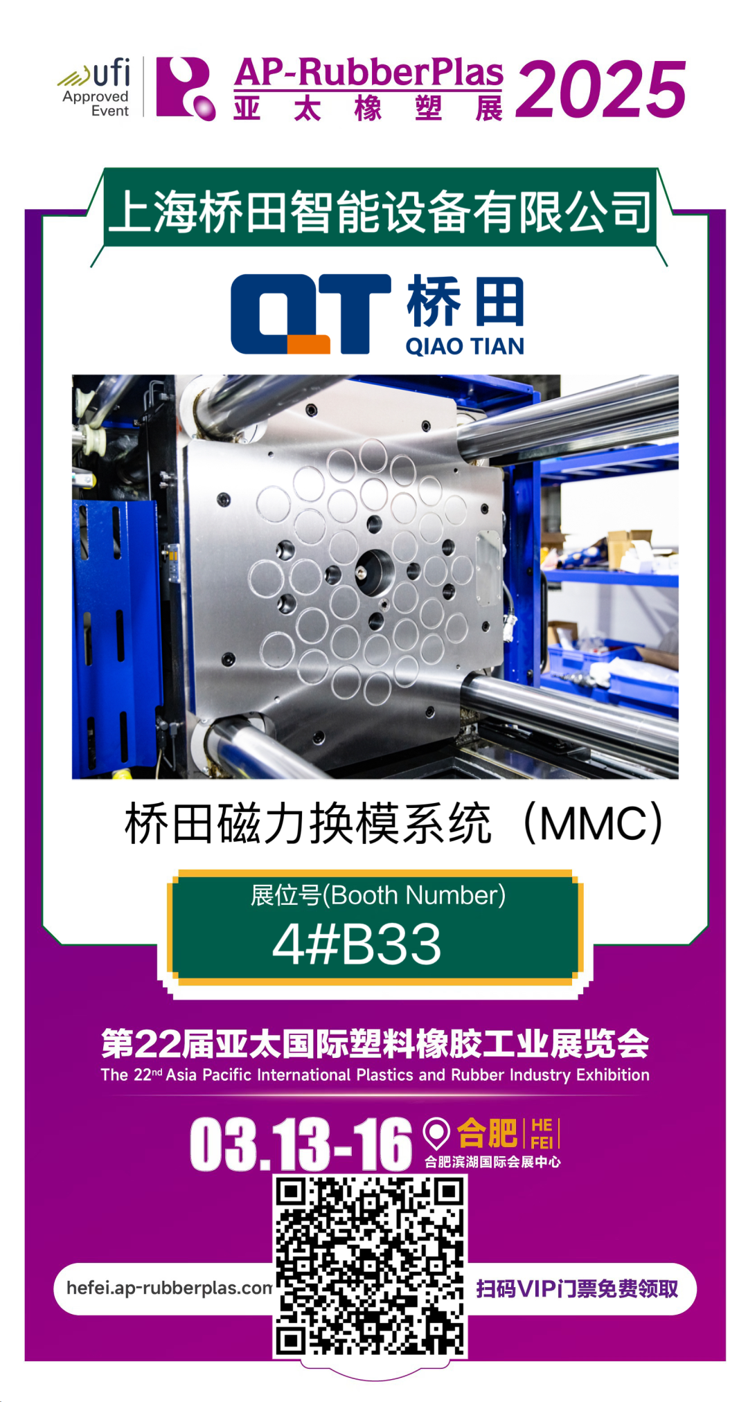 此次,橋田智能將展示自動(dòng)換模系統(tǒng)全方位解決方案,由磁力換模系統(tǒng)和工業(yè)連接器對插組合模塊組成,涵蓋動(dòng)板、靜板、控制系統(tǒng)和HMI控制面板。